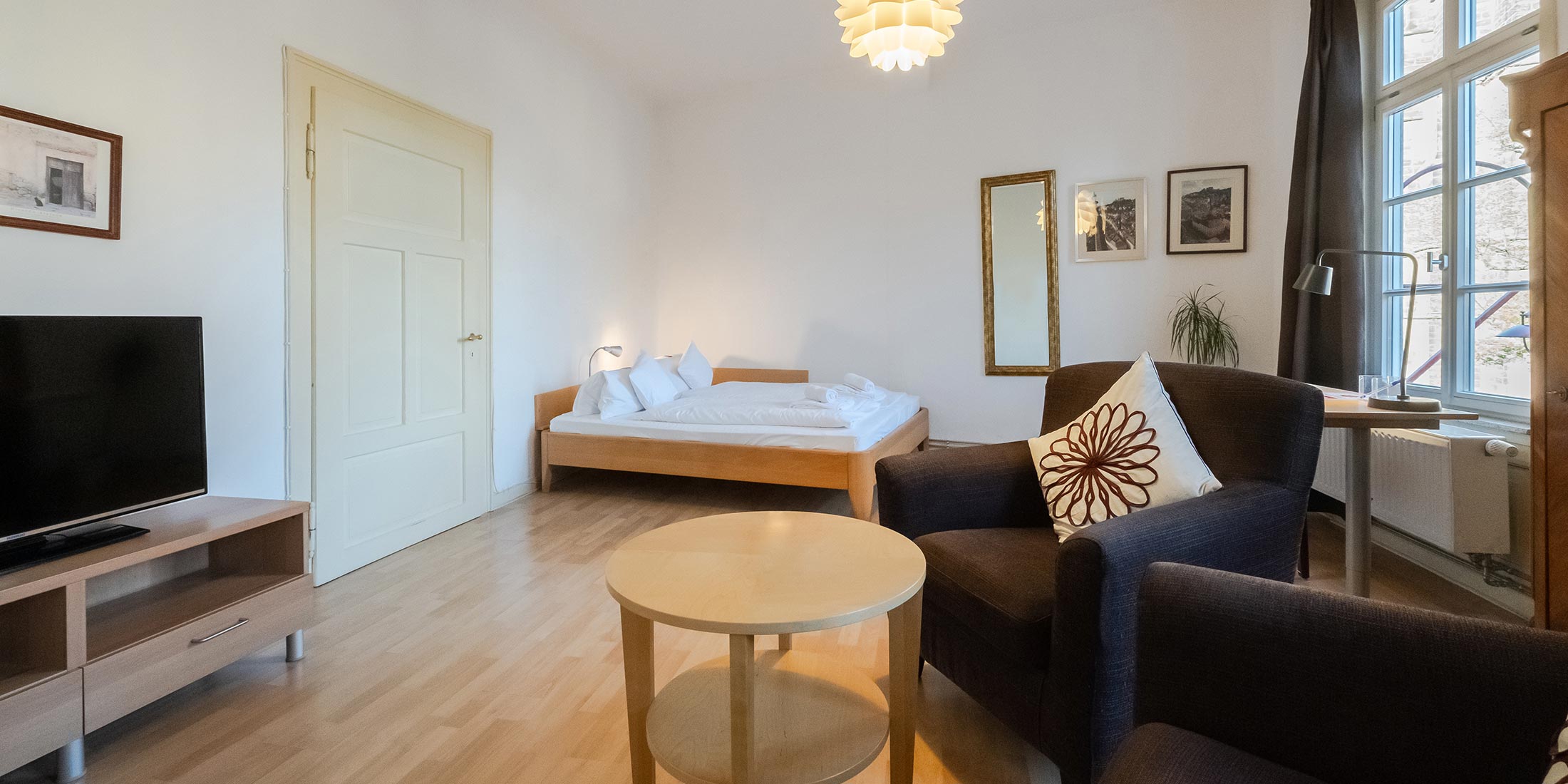 Our standard apartments have a bedroom with a living area and kitchenette as well as a private bathroom. The bedroom has one double bed and one single bed.